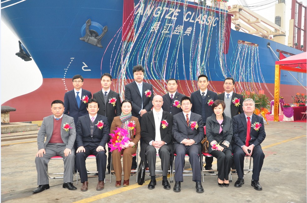 儀式中,江門(mén)市南洋船舶工程有限公司副總經(jīng)理晁明春先生、渣打銀行(香港)有限公司Russell Beardmore先生和上海長(cháng)航國際海運公司的王芳女士分別發(fā)表講話(huà)并交換了禮物。隨后,教母王芳女士為新船命名砍香檳繩,并在船廠(chǎng)人員的陪同下,與領(lǐng)導嘉賓們共同登新船視察參觀(guān)。