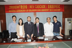 2014年5月28日上午,我司為首艘39000DWT散貨船JNS134船舉行的交船簽字儀式在公司五樓總經(jīng)理會(huì )議室進(jìn)行,公司碼頭項目組經(jīng)理馮抓綱和嘉吉船東代表PETER LEE在儀式上簽字,船東現場(chǎng)監造組和公司市場(chǎng)部人員出席了交船簽字儀式。