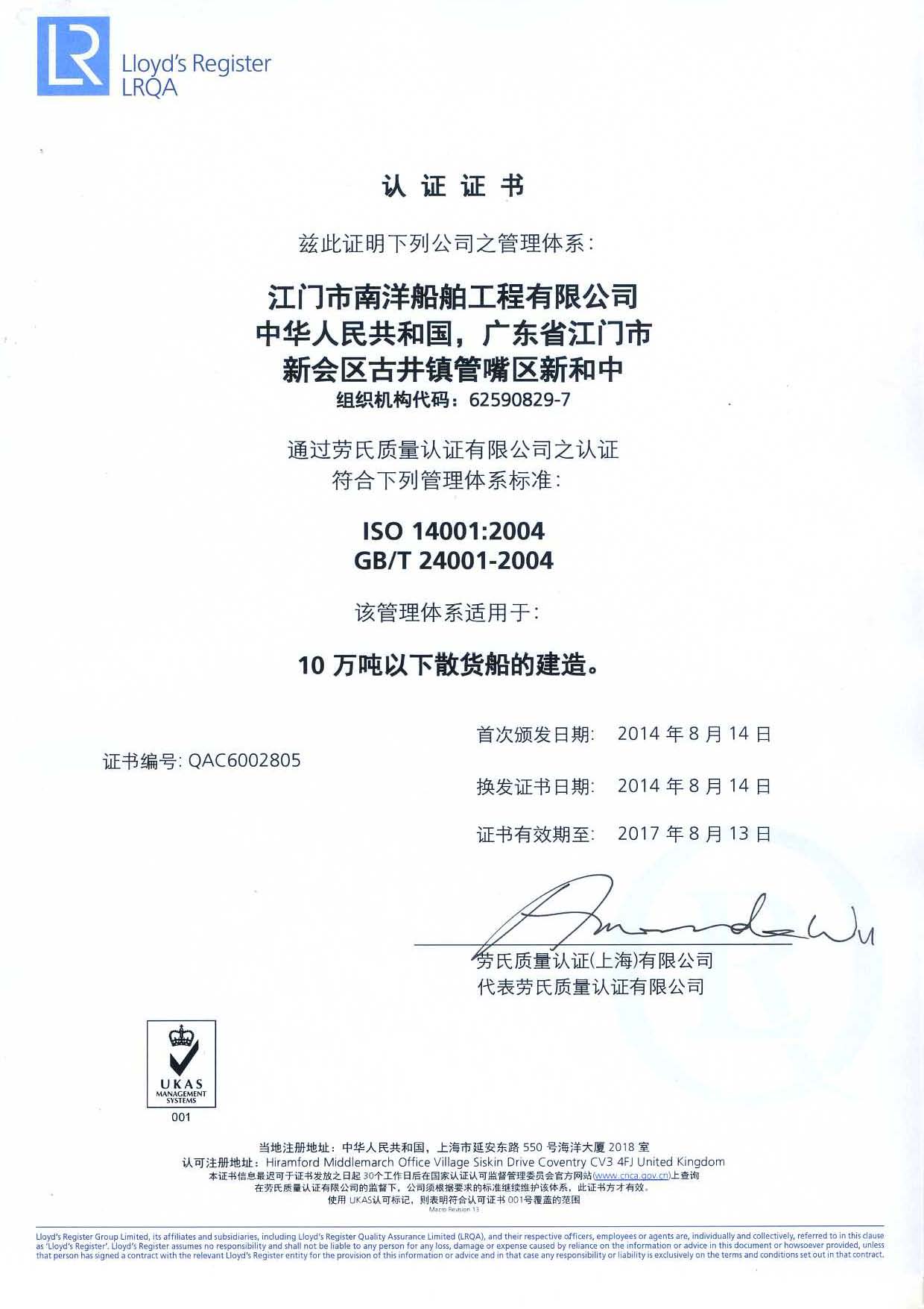 2014年8月14日,我司順利通過(guò)了ISO14001:2004環(huán)境管理體系認證。