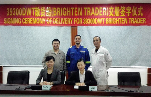 2017年1月12日上午,江門(mén)市南洋船舶工程有限公司舉辦了39300載重噸散貨船JNS149的交船簽字儀式,船東和我司雙方代表出席。