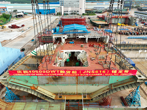 2023年5月5日,南洋重工廠(chǎng)區建造的首艘40500DWT 散貨船(JNS616)順利進(jìn)塢搭載,較原計劃提前了46天。