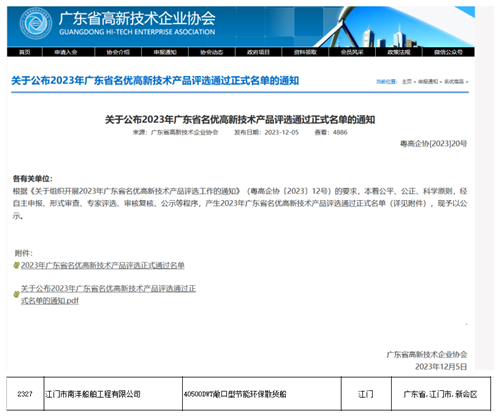 近日,廣東省高新技術(shù)企業(yè)協(xié)會(huì )發(fā)布了《關(guān)于公布2023年廣東省名優(yōu)高新技術(shù)產(chǎn)品名單的通知》(粵高企協(xié)[2023]20號),我司自主研發(fā)的“40500DWT敞口型節能環(huán)保散貨船”憑借卓越的創(chuàng )新能力和先進(jìn)的技術(shù)水平,榮獲2023年廣東省名優(yōu)高新技術(shù)產(chǎn)品稱(chēng)號。